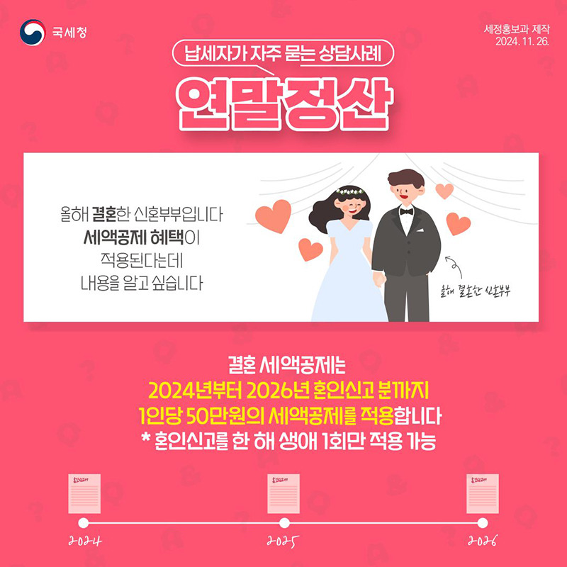 안녕하세요. 1 차 자산 관리 세금 입법 스프링은 1 차 자산 관리입니다. 작년, 올해, 그리고 내년 2026 년에 결혼 한 새로 결혼 한 부부는 각 부부에 대해 최대 50 만 원의 세금 공제를받을 수 있다는 것을 알고 있습니까? 공제 혜택이므로 조건이라면 신청해야합니다. 여러분 중 일부는 이미 연도 -엔드 정산 데이터를 제출했을 수도 있지만 여전히 제출중인 경우이 게시물을 확인하십시오. 결혼식 세 공제 문서, 신청서 및 예방 조치를 소개하고 싶습니다. 증거가 필요합니까?